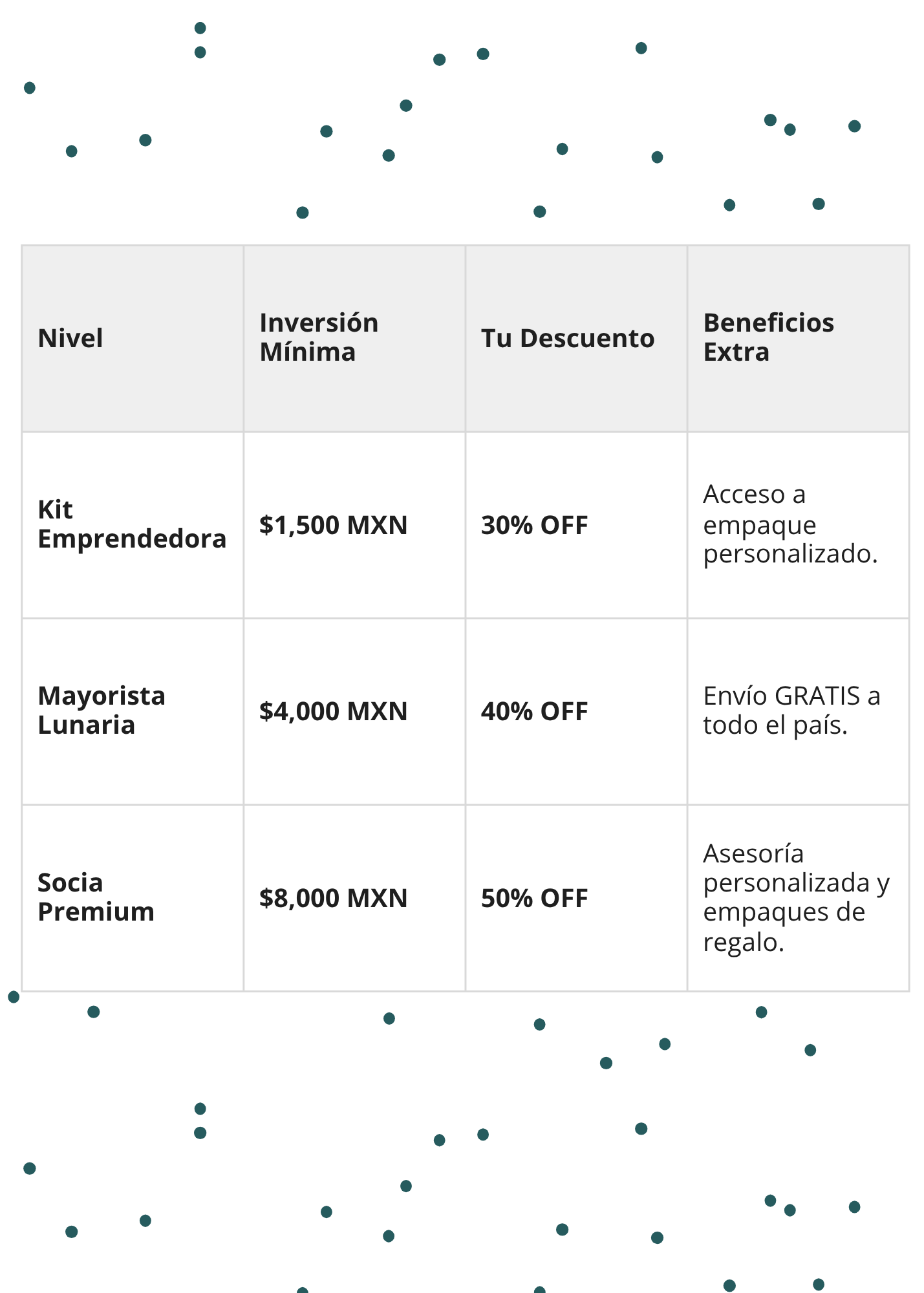 No importa si estás empezando o si ya tienes un negocio establecido, tenemos una modalidad para ti. Los descuentos se aplican automáticamente sobre el total de tu pedido.